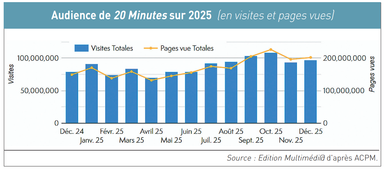 Avec ses 100 millions de visites par mois, seuil atteint en 2025, 20 Minutes – média « 100 % numérique » depuis l’abandon du papier en juillet 2024 – bascule sous « conditions » dans les mains du groupe belge Rossel (Le Soir, La Meuse, …), bien implanté aussi dans le Nord de la France (La Voix du Nord, Courrier Picard, …).