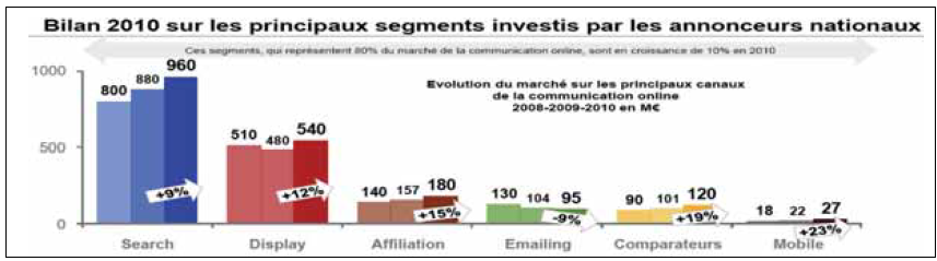 23 % en 2008). Et cette année, la croissance sera à deux chiffres : 12 %, à 2,57 milliards d’euros. Pour l’an dernier, les dépenses pour des liens sponsorisés sur les moteurs de recherche – Google en tête (2) – dominent encore (voir ci-dessous), suivies de l’affichage (« display ») revigoré par la publicité vidéo. Cette dernière engrange 30 millions d’euros, soit 150 % de hausse grâce aux nouveaux services de VOD, de catch up TV ou encore des vidéos sur la presse et la radio online. Quant à la publicité sur téléphone portable, elle fait un bond de 23 %, à 27 millions d’euros, grâce aux smartphones et aux « applis ». @