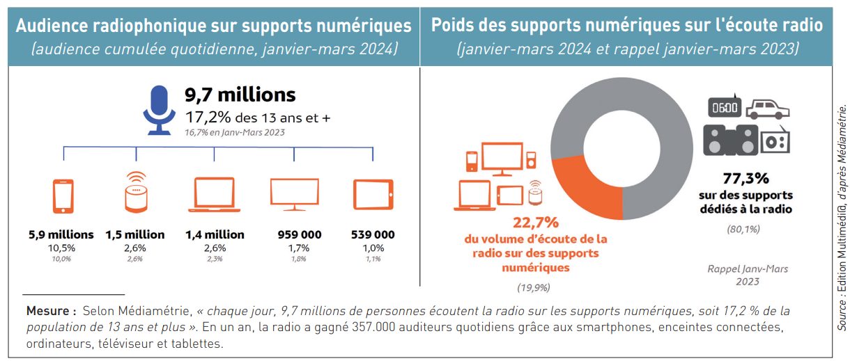 Si son audience cumulée peut encore battre des records, le média radio n’en est pas moins en pleine fragmentation de cet auditoire qui se disperse en fonction des modes de diffusion : en analogique (FM), en numérique (DAB+) ou sur Internet (live streaming, replay, podcast, …). Cet éclatement radiophonique induit une multitude d’appareils de réception utilisés et des situations d’écoute désormais très différentes : chaque jour en France, au premier trimestre, la radio a totalisé 38,7 millions auditeurs en moyenne chaque jour, à raison de 2h26 quotidiennes par auditeur (toujours en moyenne), dont 77,3 % sur des supports dédiés à la radio tels que l’autoradio d’un véhicule, la chaîne hi-fi ou le poste de radio, et 22,7 % sur des supports numériques tels que les smartphones (5,9 millions d’auditeurs quotidiens), les enceintes connectées (1,5 million), les ordinateurs (1,4 million), téléviseurs (959.000) et les tablettes (539.000). D’après Médiamétrie sur la période de janvier à mars 2024, ce basculement de l’écoute de la radio sur ces supports numériques a engendré sur la même période un nouveau record, à 9,7 millions de personnes écoutant chaque jour la radio sur de ces appareils non dédiés à la radio (voir graphiques). Les Français sont davantage équipés en supports multimédias (97 %) qu’en supports dédiés à la radio (90 %), sachant que 99 % des foyers disposent d’au moins un support pour écouter la radio (qu’il soit dédié ou pas). Cette décorrélation progressive de ses récepteurs dédiés historiques (postes de radio, autoradios, radio-réveil, tuner de chaîne hi-fi) fait entrer le média radio dans le flux numérique des contenus en ligne. En se délinéarisant (en live, en différé ou en podcast), la radio perd un peu de sa spécificité. La radio devient un contenu comme un autre à l’ère de la plateformisation numérique. Les éditeurs de stations radio doivent investir dans plusieurs support (FM, DAB+, applications, sites web, podcasts) pour aller cherche l’auditeur là où se trouve. Si les grandes radios ont les reins solides pour faire face à ces coûts de multidiffusion, il n’en va pas de même pour les radios indépendantes et plus encore pour les radios associatives. Ces dernières sont pour 75 % d’entre elles présentes en DAB+ et ont été les premières à soutenir depuis 2014 cette technologie numérique, lancée d’abord à Paris, Marseille et Nice et couvrant à ce jour plus de 60 % de la population métropolitaine.