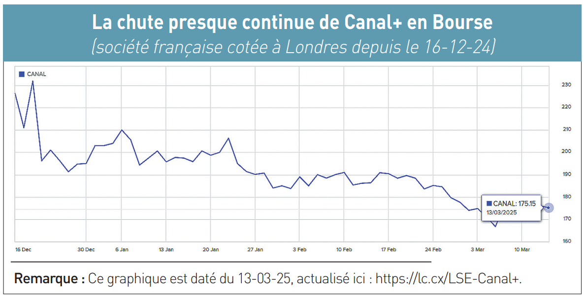 Introduite à 290 pence à l’ouverture de la Bourse de Londres le 16 décembre 2024, l’action « CAN » du groupe Canal+ ne vaut plus que 175,1 pence le 13 mars 2025, au moment où nous bouclons ce n°339 de Edition Multimédi@, ce qui représente une chute de – 39,6 % (voir graphique). Et sa valorisation n’est plus que de 1,7 milliard de livres sterling (2 milliards d’euros). C’est une grosse déception pour les actionnaires, à qui la direction de Vivendi – l’ex-maison mère de Canal+ – avait fait miroiter une capitalisation potentielle d’environ 6 milliards d’euros.