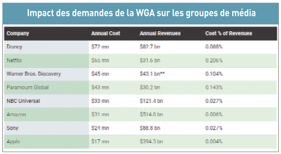 A la veille de leur mouvement social déclenché le 2 mai, les scénaristes de la WGA avaient publié un état de leurs revendications et des réponses ou non-réponses apportées par les groupes de médias (5). Mais au point d’étape des négociations au 24 août dernier, soit au 115e jour de grève, peu d’avancées étaient signalées par le syndicat des scénaristes : « Lors de la rencontre avec les PDG, nous avons passé deux heures à expliquer que, malgré les progrès réalisés, le langage de l’offre de l’AMPTP était, comme c’est typique de cet organisme, une façon de donner d’une main et de reprendre de l’autre. (…) L’AMPTP semble donner tout en limitant les gains réels », relève-t-il. La WGA donnent quelques exemples de propositions qui ne sont pas encore suffisantes (6). Par exemple, les groupes de médias de l’AMPTP disent avoir fait une concession majeure en offrant de permettre à six membres du personnel de la WGA d’étudier les données, limitées, sur le nombre de téléspectateurs en streaming pour les trois prochaines années, afin que ces six membres puissent revenir en 2026 pour demander une fois de plus un solde basé sur le nombre de téléspectateurs. Mais entre temps, regrette la WGA, « aucun scénariste ne peut être informé de l’état de leur projet, et encore moins recevoir un résidu basé sur ces données ». La WGA a en outre calculé le coût de ses demandes pour chaque entreprise de média et chaque plateforme, « y compris l’ajout d’un financement accru de la santé pour faire face à l’impact de la grève ». Si l’on prend le cas de Netflix, les propositions de la WGA lui coûteraient 65 millions de dollars par an, soit seulement 0,206 % de son chiffre d’affaires 2022 de 31,6 milliards de dollars.