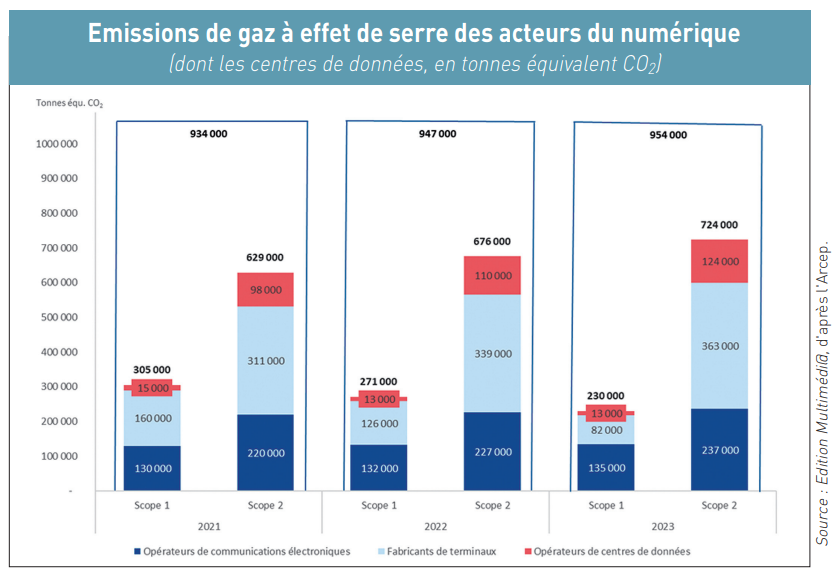 Rien qu’en France, les émissions de gaz à effet de serre (GES) émis ensemble par les acteurs du numérique que sont les fabricants de terminaux, les opérateurs télécoms et les opérateurs de centres de données dépassent largement le million de tonnes de CO2. Dans son enquête annuelle, l’Arcep a non seulement interrogé vingt-et-un opérateurs de centres de données, mais aussi quatre opérateurs télécoms (Orange, Bouygues Telecom, Free et SFR), vingt-trois fabricants de terminaux (smartphones, tablettes, ordinateurs portables, écrans d’ordinateur et téléviseurs) et quatre équipementiers de réseaux mobiles. Il en ressort qu’en 2023 le volume de GES rejeté par ces quatre catégories d’acteurs du numérique s’est élevé à 954.000 tonnes équivalent CO2, soit l’empreinte carbone annuelle de près de 102.000 personnes en France cette année-là. « Ces émissions progressent légèrement, d’environ 1 % par an depuis 2021, dans un contexte de baisse des émissions globales de gaz à effet de serre en France (- 5,8 % en 2023) », souligne l’Arcep. Il ne serait pas surprenant que les prochaines enquêtes annuelles portant sur 2024 et 2025 montrent des centres de données beaucoup plus énergivores. @