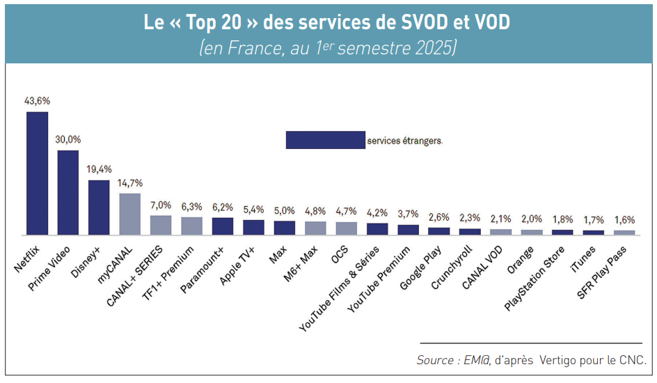 Le premier semestre 2025 confirme encore une fois l’ultra-prédominance en France des plateformes américaines de vidéo à la demande (SVOD et VOD), d’après le baromètre du Centre national du cinéma et de l’image animée (CNC) publié le 10 septembre dernier. Premier constat : tous les « services étrangers » sont en fait des plateformes américaines, avec toujours en tête les trois poids lourds du streaming vidéo que sont Netflix, Amazon Prime Video et Disney+. A eux trois, ils attirent un total non-dédupliqué de 93 % d’internautes.